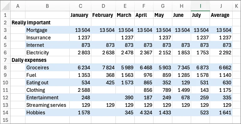 Daily expenses. Group your everyday expenses for a more organized and convenient way of tracking. This makes it easy to report on expenditures that fluctuate from month to month. Examples of spending categories in this group are Groceries, Household Items, Fuel, Eating Out, Clothing, Personal Care, Gifts, Entertainment, Streaming services, News (paper) subscriptions, and Charities.