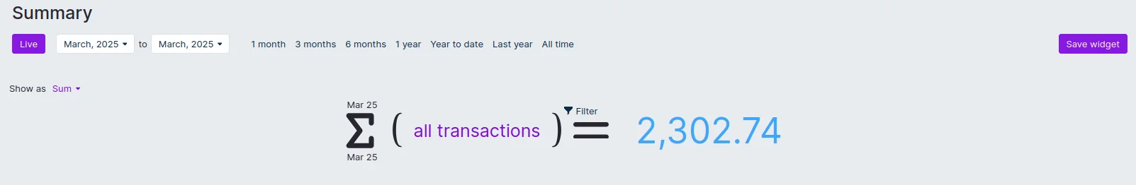 The summary card provides an overview of all transactions within a selected time period, offering options such as total sum or monthly average.