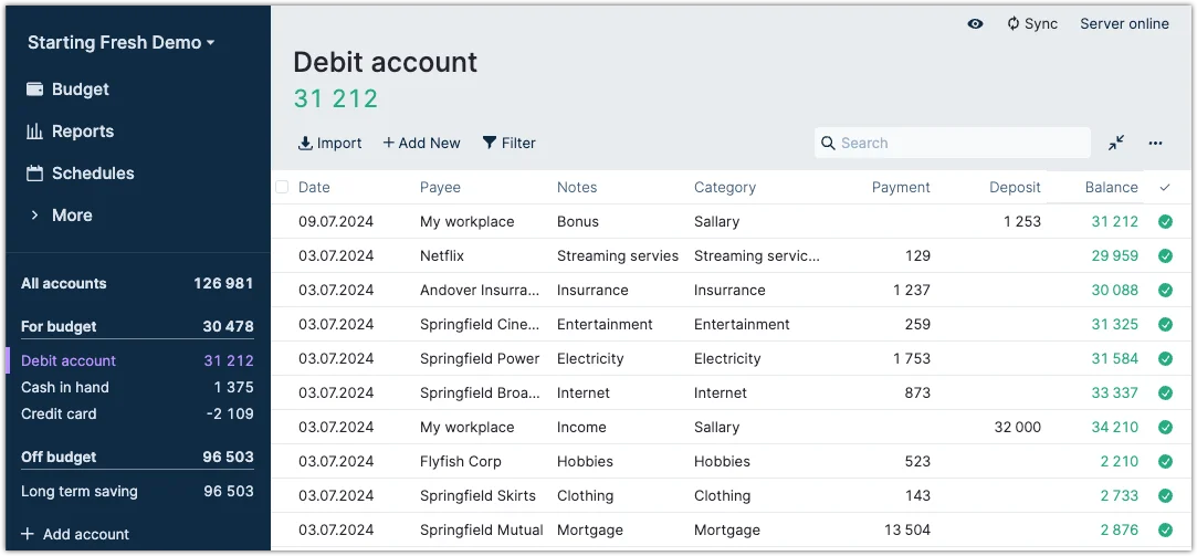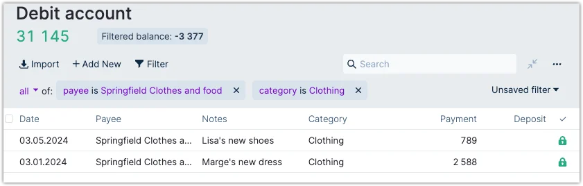 Clicking on the Filter lets you filter on all the fields. In the screenshot, we see that we filtered for where the Payee is Springfield Clothes and food and the Category equals just Clothing.