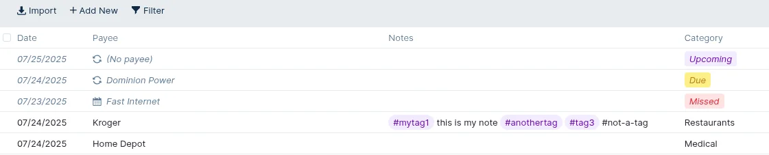 Transactions can be easily flagged and identified in the table by tagging them through their notes.